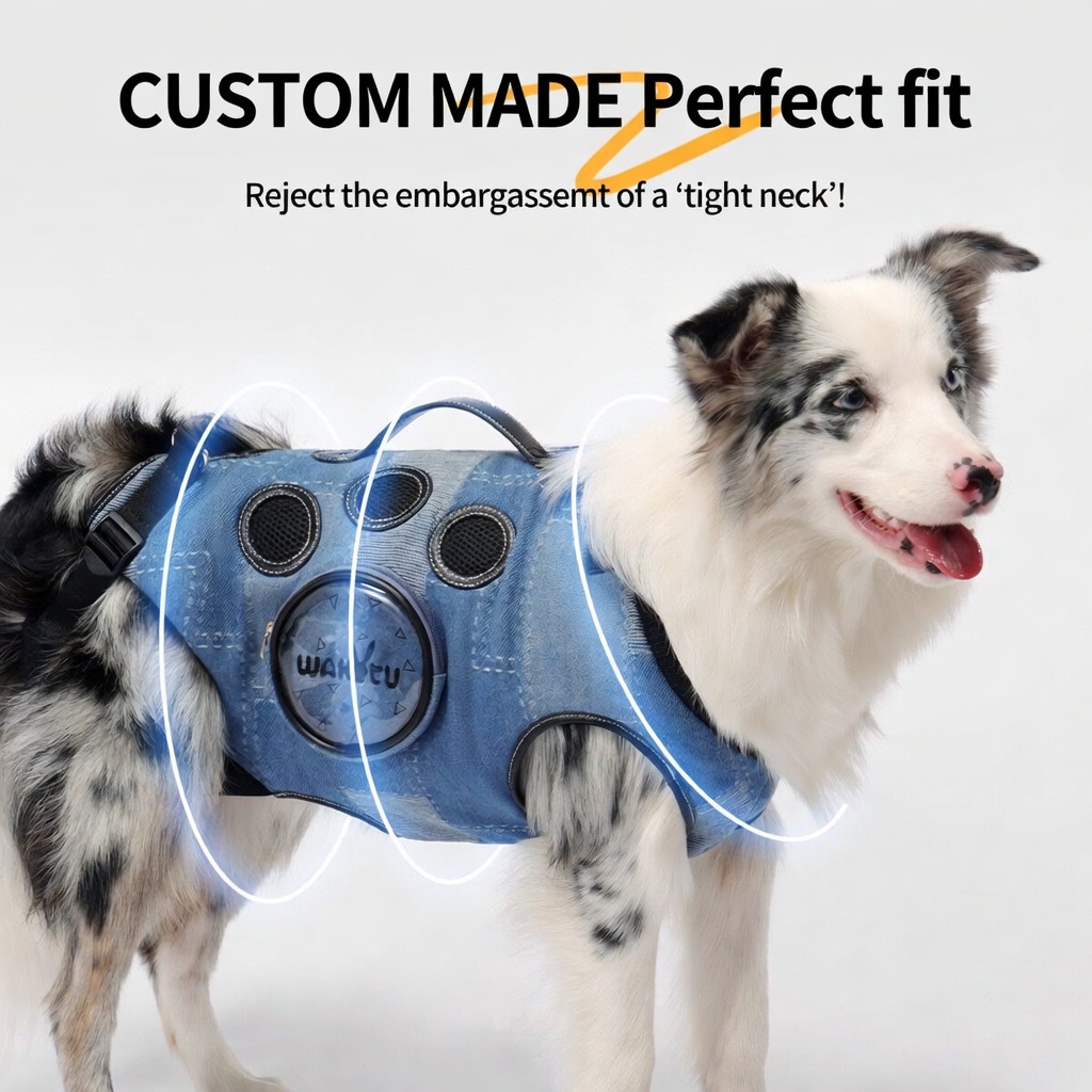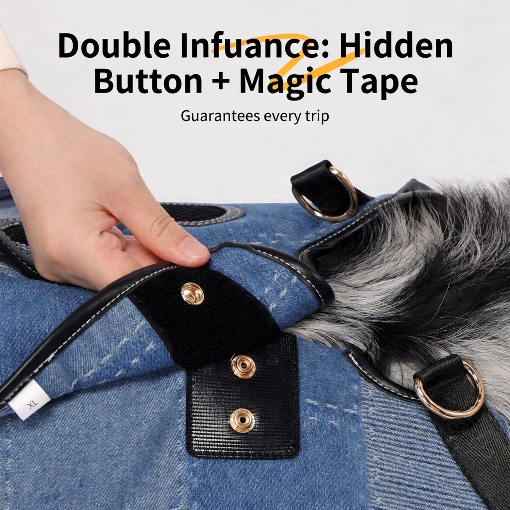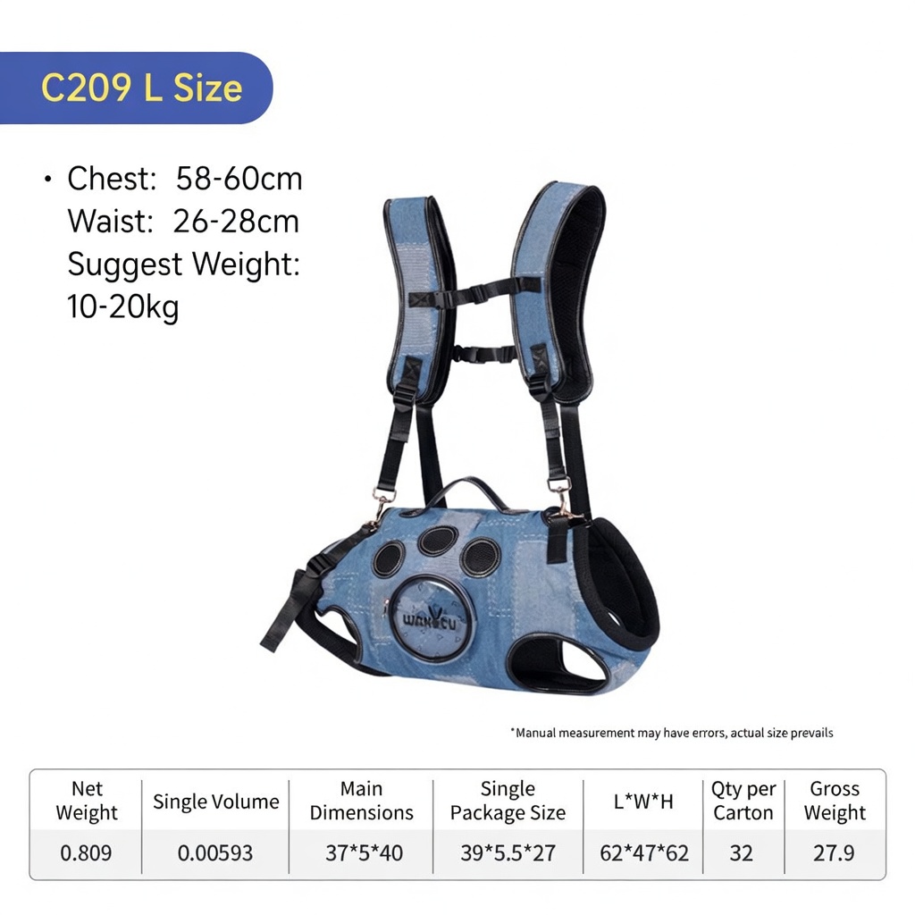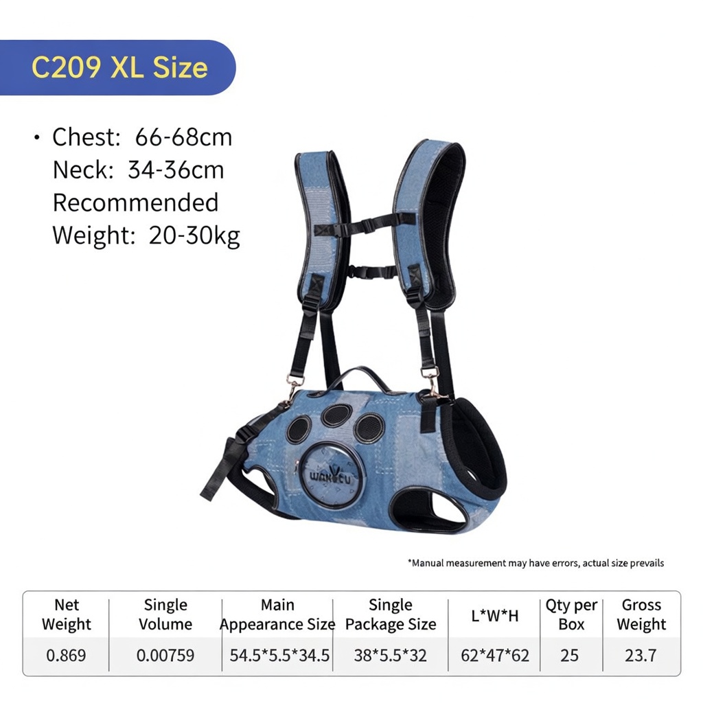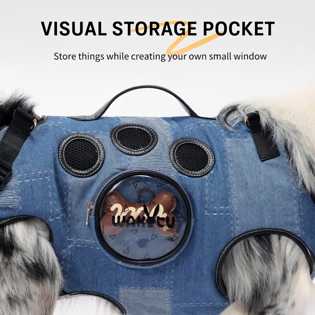 The Denim Pet Carrier Backpack is a fashionable and practical hands-free solution for pet parents who want to keep their furry friend close and safe. Designed in a trendy denim style with excellent breathability, it features multiple mesh ventilation holes for optimal airflow and a clear transparent storage pocket that lets you store treats, poop bags, or small items while creating a cute display window. The adjustable padded shoulder straps and chest buckle provide a secure and comfortable fit for the owner, while the double safety system (hidden buckle + magic tape) ensures your pet stays safely in place. Available in L and XL sizes to fit dogs with chest girths from 58-68cm and recommended weights up to 30kg, this versatile carrier is ideal for daily walks, travel, hiking, or simply bonding with your pet on the go. Custom-fit design helps prevent neck choking discomfort, giving both you and your dog a stress-free and stylish experience.